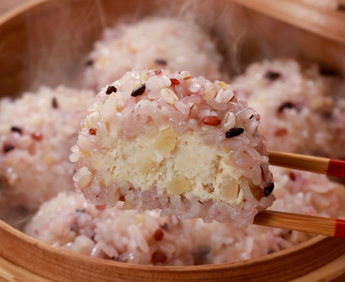 新鮮なブランド地鶏を使った餡に、もち米とたっぷりの十穀米をまとわせふんわりと蒸しあげた香り高く滋味深いもち米鶏しゅうまいです。